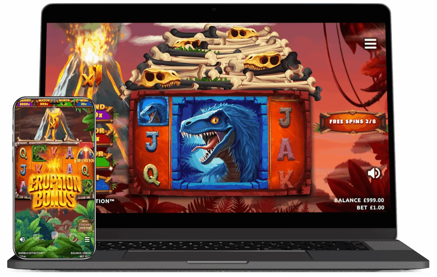 Build your fortune with the Eruption Bonus, collecting ancient bones to hold back the rising lava. When the pressure becomes too great, the eruption bursts — showering coins and wilds across the reels in a spectacular volcanic display.